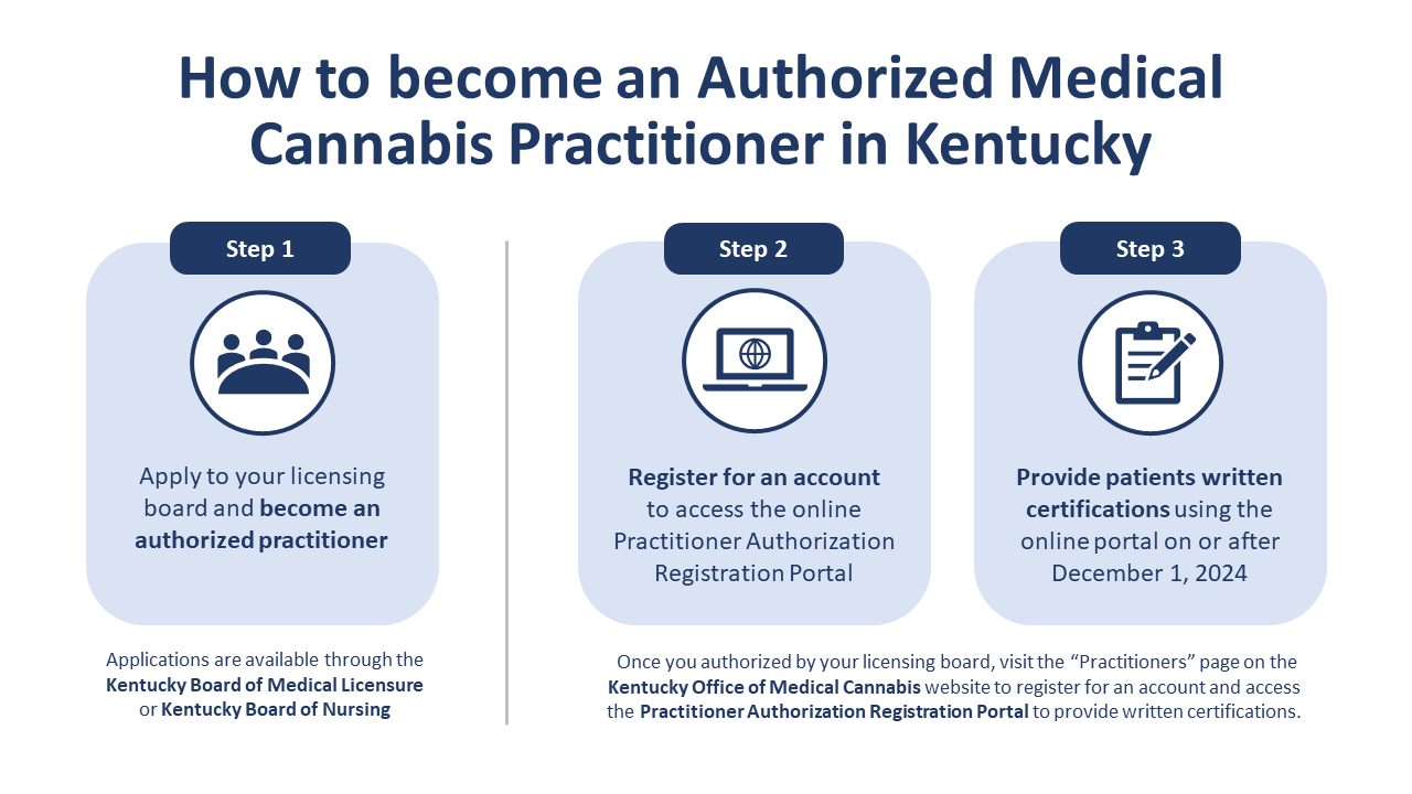 Pursuant to KRS 218B.050(10), the Kentucky Board of Medical Licensure recently completed process of promulgating the administrative regulation, 201 KAR 9:067 that establishes procedures for applying for authorization to provide written certifications; the process and procedures for renewing authorization to provide written certifications; continuing education requirements for medicinal cannabis practitioners; reasons for which authorization to provide written certifications for the use of medicinal cannabis may be suspended or revoked; and the minimal standards of care, including record maintenance and follow up requirements.